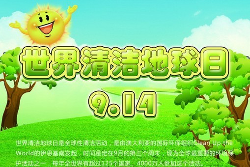 世界清潔地球日又名世界清潔日,英文為Clean Up the World Weekend (CUW Weekend),是全球性清潔活動,是由澳大利亞的國際環(huán)保組織Clean Up the World的伊恩基南發(fā)起,時間是定在9月的第三個周末,現(xiàn)為全球非常重要的環(huán)境保護(hù)活動之一,每年全世界有超過125個國家、4000萬人參加這個活動。2006年的世界清潔日活動時間為9月15日至17日3天。也有參與組織和個人把每年的9月14日作為活動時間。