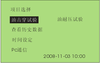7 通過旋轉鼠標可以選擇進行擊穿試驗,耐壓試驗,查看歷史數據,時間設定和PC通信等操作項目。