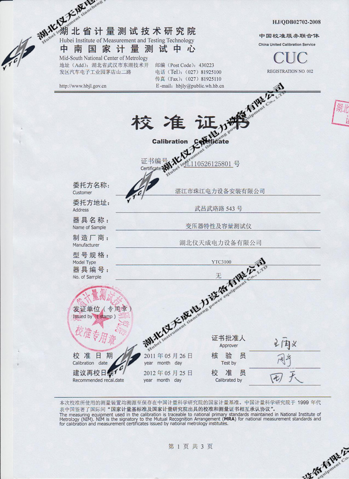 YTC3100變壓器特性及容量測試儀的資質(zhì)證書